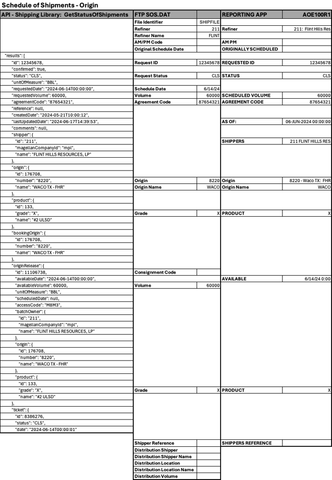Yes. This article provides a comparison of the Schedule of Shipments data from the SOS.DAT report (FTP), AOE100R1 report (Reporting App) and the GetStatusOfShipments data in the Shipping Library accessed through the Swift+ API.