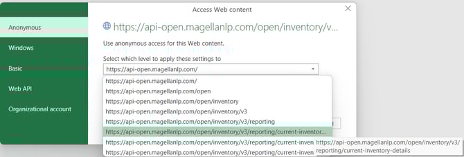 Select "Done". If the Access Web Content box appears, scroll down to appropriate API. This can be difficult to read as the URLs are generally longer than the dialog box, so hover and read the text box.