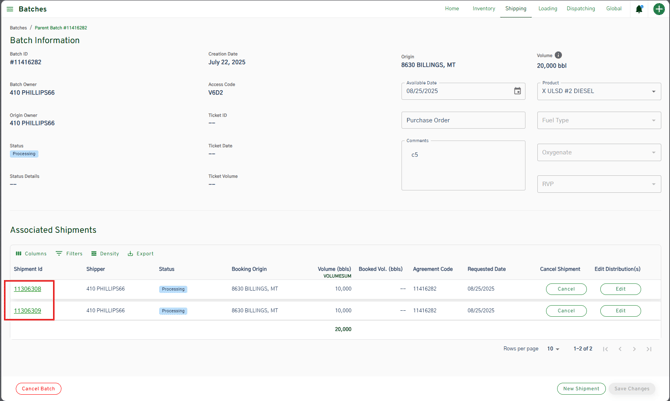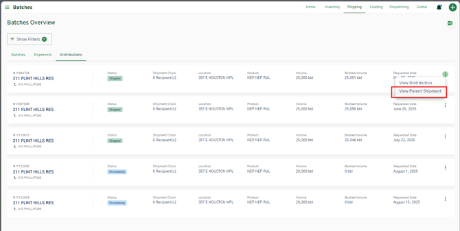 From the Distributions overview, user can navigate to the parent Shipment, regardless of status. Note: Shipment details are available only if the Batch is the assigned Shipper.
