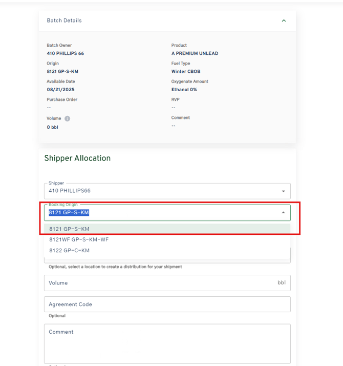 The selected 'Booking Origin' field persists (remains) when a user navigates away from the Shipper Allocation step during Batch creation.