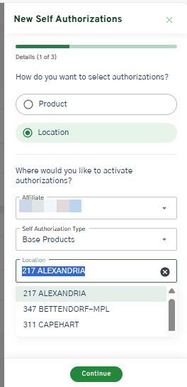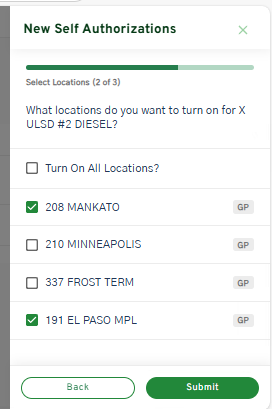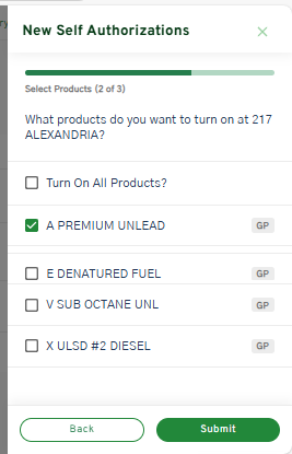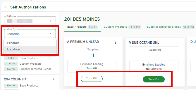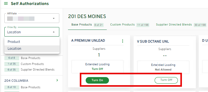 1. Select applicable products or applicable locations to authorize (enable). Users can also select 'Turn on All Locations?' or 'Turn on all Products? for a bulk activation.