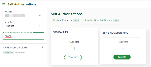 - Click Turn On for the necessary products under the Custom Products tab or Supplier Directed Blend tab.