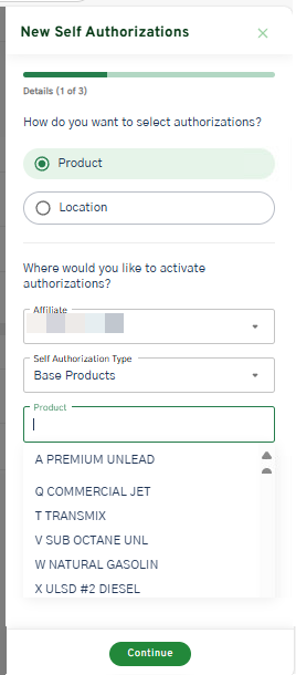 After products are enabled, user can verify by navigating to the main Self Authorization card screen. Use the filters on the upper left-hand corner.