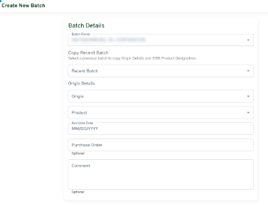 - 'Copy Recent Batch' feature has been added at the top to streamline the process if entering your Origin Details and 1090 Product Designation.