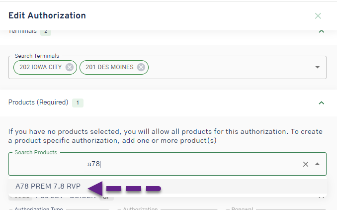 4. Scroll to Search Products. Click within the Search Products field and type the Product to authorize. Click to add.