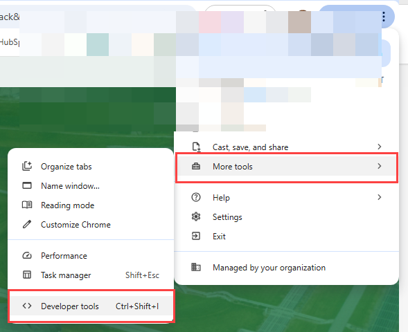 - Scroll to More Tools > Developer Tools. If F12 does not work, try Ctrl-Shift-R.