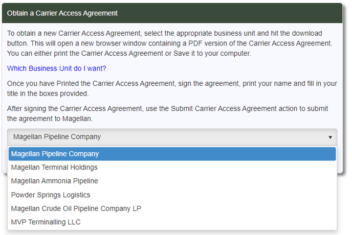 - Select the Magellan Business Unit (ex: Magellan Pipeline Company or MPL) that matches the CAA you just signed