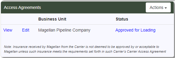 Once your Access Agreement is approved, your carrier dashboard will show "Approved for Loading" for that business unit.