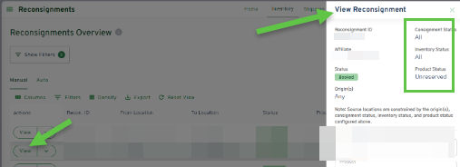 - New View Drawers: View-only drawers for Reconsignment and Auto-Reconsignment show extra details like Consignment, Inventory, Product Status, and Origins.