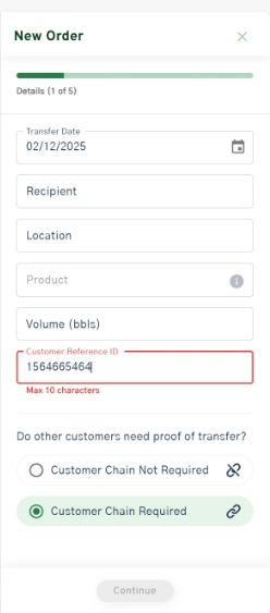 - Customer Reference ID: A visual pop-up notification displays if the user attempts more than the allowed 10-character limit.