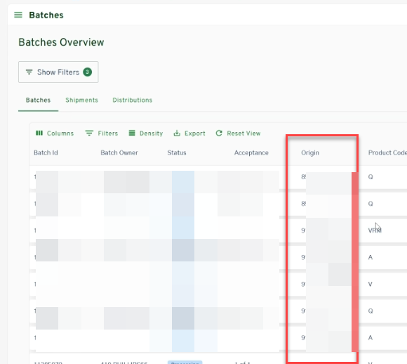 - In the Batches list view, the correct Origin name displays under the Origin column in the Batches tab.