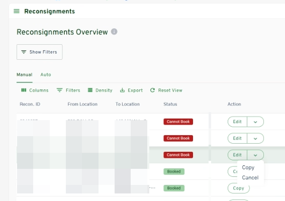 - The Cancel functionality is available for Reconsignments with a Cannot Book status.