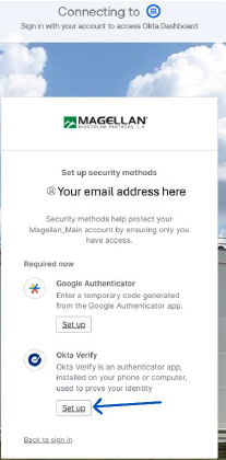 - Click ‘Set Up’ under ‘Okta Verify’ (blue arrow).