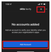 - Open the ‘Okta Verify’ app on your Android or iOS device. If this is the first account you are adding to ‘Okta Verify’ please click ‘Add Account’, otherwise click the plus button in the top right corner once the app launches.