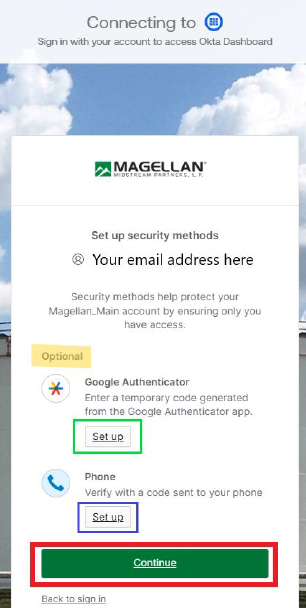 - These steps are optional and will have separate instructions. The ‘Google Authenticator’ setup (green box) can be found here. The Phone set up (blue box) can be found here. If you click ‘Continue’, you will be taken to step 19.