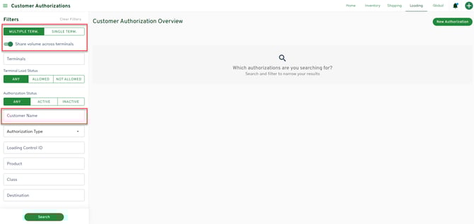 Tip: Start with searching by Multiple Term or Single Term. If you can't find a Customer Authorization, switch between them and the "Shared volume across terminals" toggle-switch. Sometimes, a Multiple Terminal authorization may only have one terminal designated.